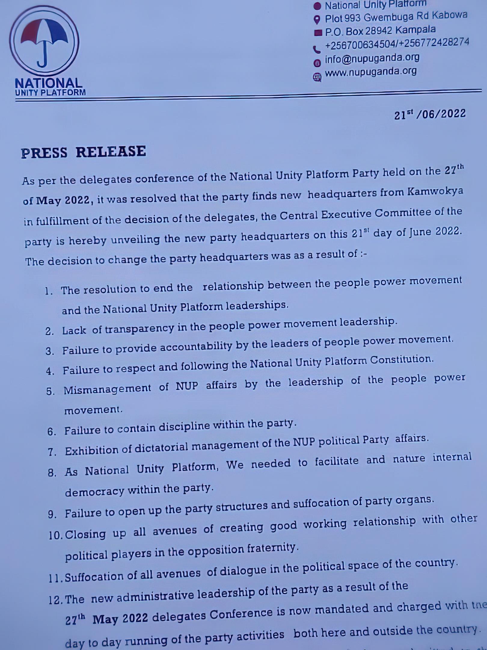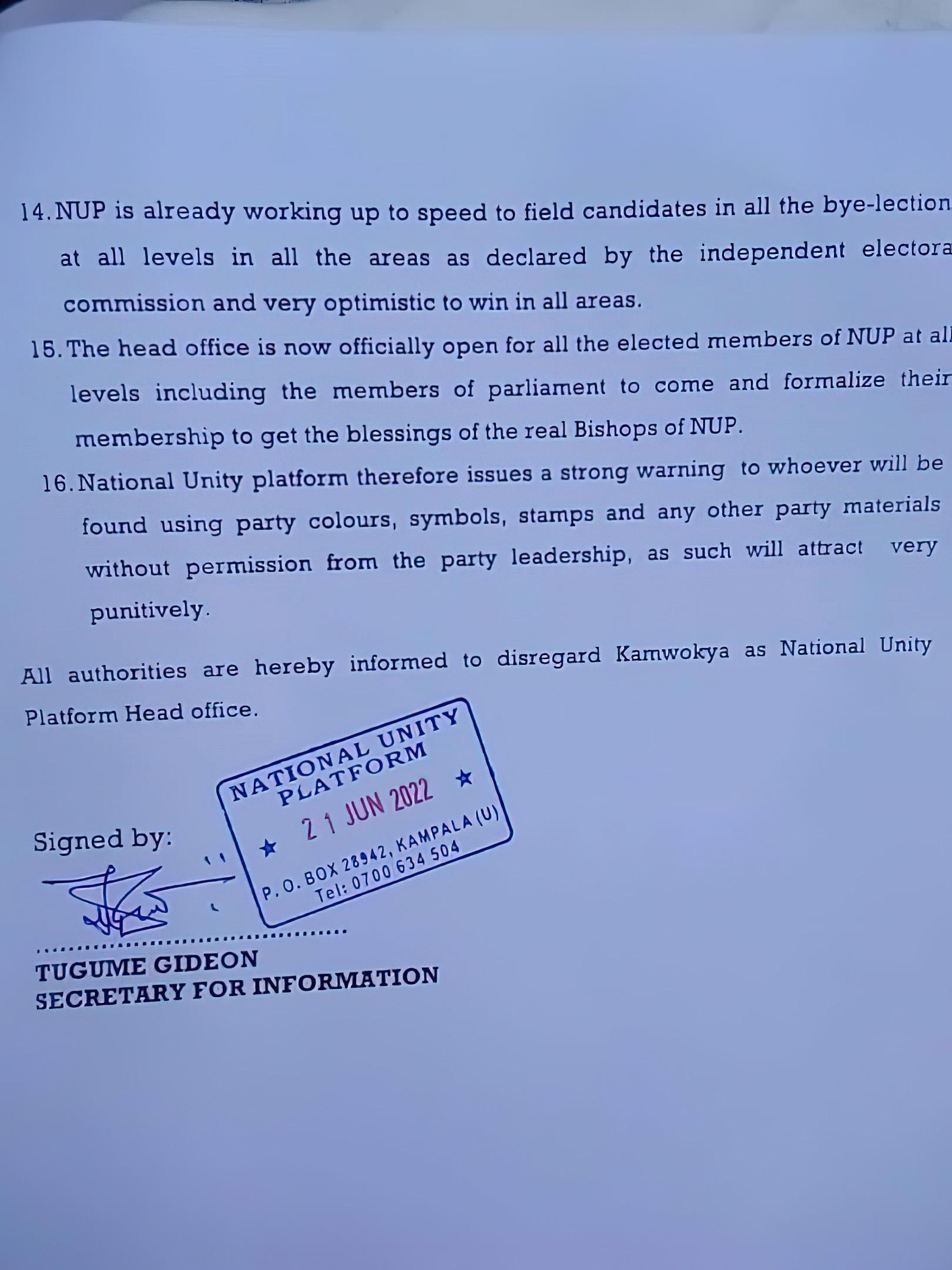 According to Kibalama’s leadership, they held a delegates’ conference on 27th May 2022 at A4D Hotel in Mbalala, Mukono district in accordance to the NUP Constitution Article 11(4) subsection (1) where they took over the ownership of the party.